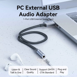 С тази външна USB звукова карта получавате лесно включване (plug-and-play) и широка съвместимост, което я прави отличен избор за лаптопи и настолни компютри. Поддържа OMTP & CTIA аудио стандарт, което улеснява използването с различни слушалки и хендсфри устройства.