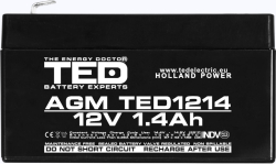 Оловна батерия TED ELECTRIC, 12V - 1.4 Ah- 98-43,5-53 mm AGM е надеждно решение за резервно захранване в UPS системи и други устройства, изискващи стабилно 12V напрежение. AGM технологията я прави подходяща за приложения, където се търси сигурна и предвидима работа.