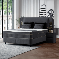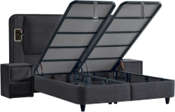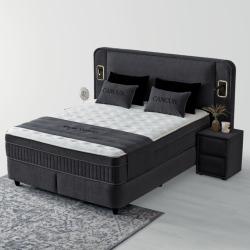 Тапицирана спалня с матрак CANCUN 160 x 200 - сив 18 разполага с ракла за съхранение и амортисьор за повдигане, което улеснява достъпа и помага да организирате спално бельо и вещи без да заемате допълнително място. Отличен избор за легло 160/200, търсещи тапицирано легло с ракла и завършен комплект за спалня.