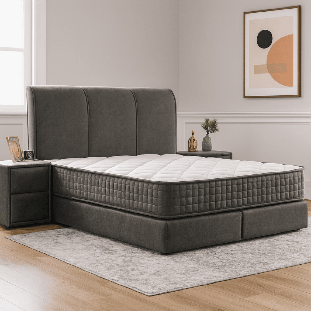 Комбинацията от метална конструкция, плоскости и мека тапицерия при таблата и страниците осигурява надеждна опора и приятен допир. Включеният матрак с покет пружини и естествени вложки подпомага равномерното разпределение на тежестта и допринася за по-спокойна почивка, а умерено меката твърдост е добър избор за хора, които търсят балансирано усещане.