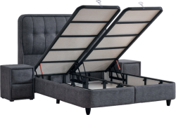 За по-добра организация в дома, Тапицирана спалня с матрак PICASSO 160 x 200 - графит 501 разполага с ракла за съхранение и амортисьор за повдигане, които улесняват ежедневната употреба. Подсилената метална подматрачна рамка и тапицираните елементи допълват усещането за стабилност и завършен дизайн — практично решение за легло с ракла и спален комплект в едно.