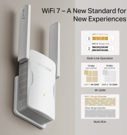 Mercusys ME25BE BE3600 е Wi‑Fi 7 удължител на обхват, създаден да разшири покритието и да премахне „мъртвите“ зони у дома или в офиса. Осигурява двубандова връзка с комбинирана скорост до 3600 Mbps за по-плавен стрийминг, игри и работа.