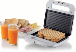 С мощност 750 W този сандвич тостер загрява бързо и помага да получите апетитно запечени тостове с минимално чакане. Площта за готвене 230 x 130 мм е подходяща за стандартни филии, а корпусът в бял цвят се вписва естествено в различни кухненски интериори.
