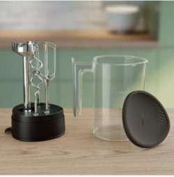 PHILIPS Mixer 500W е многофункционален миксер с мощност 500 вата и пет степени на работа, включително турбо режим. Той предлага функции за разбиване, смесване, пасиране и кълцане, което го прави подходящ за различни кулинарни задачи. Уредът идва с разнообразни аксесоари – бъркалки за тесто и разбиване, метален накрайник за пасиране и мерителна кана от неръждаема стомана. Корпусът е изработен от пластмаса, а миксерът разполага с защита срещу пръски и плавен контрол на скоростта за удобство при работа. Ергономичната мека дръжка и LED дисплеят допълват функционалността му. Всички части могат да се мият в съдомиялна машина, а гаранцията на продукта е 24 месеца. Цветът на миксера е черен.
