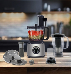 Кухненският робот идва с разнообразие от аксесоари, включително дискове за френски пържени картофи, джулиен, нарязване и ренде, както и инструменти за месене, разбиване и бъркане. Голямата фуния за подаване на продукти и детекторите за купата и капака осигуряват безопасност и удобство при работа. ABS корпусът, нехлъзгащите се крачета и хромираният циферблат придават стабилност и стилен външен вид. Всички подвижни части са безопасни за миене в съдомиялна, а вграденото съхранение на кабела улеснява организацията на кухнята.
