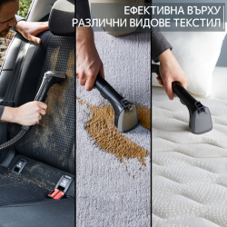 Моделът разполага с основна текстилна четка с ширина 15 см и допълнителна четка за почистване 8 см, подходяща за по-малки или труднодостъпни места. Регулирането на мощността става директно от дръжката, което улеснява управлението по време на работа. Компактният дизайн и тегло от 6.6 кг правят Rowenta IN5012F0 Instant Clean It идеален избор за удобно и ефективно почистване в дома.