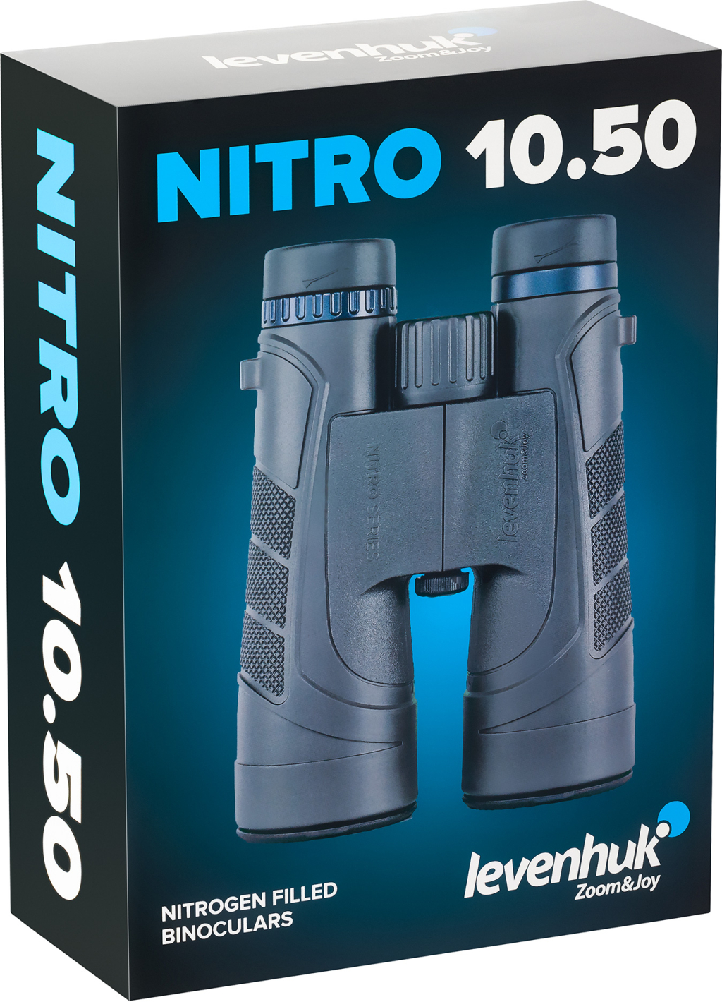 В бинокъла Levenhuk Nitro 10x50 са комбинирани отлични оптични характеристики, леко тяло и надеждност. Този бинокъл е отличен спътник на всеки ловец или рибар. Цялостното многослойно покритие на оптичните елементи и 50-милиметровата апертура осигуряват достатъчно светлина, за да се получи ясен образ дори при облачно време или в здрач, а увеличението 10x ще Ви позволи да изследвате подробно представляващите интерес за Вас обекти дори от голямо разстояние.