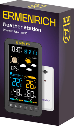 Метеорологичната станция Ermenrich Report WR30 е многофункционално домашно устройство, което е полезно както за измерване на атмосферни параметри (влажност, температура, атмосферно налягане), така и за ежедневна употреба, като осигурява бърз достъп до важна информация като час, текуща дата, прогноза за времето или фаза на луната. Големият, цветен и лесен за четене екран показва ясен текст и интуитивни икони, които дори най-младият член от семейството може да разбере. В долната част на екрана са разположени две скали за оценка на общите показатели за комфорт, изчислени въз основа на данни за вътрешните и външни условия.