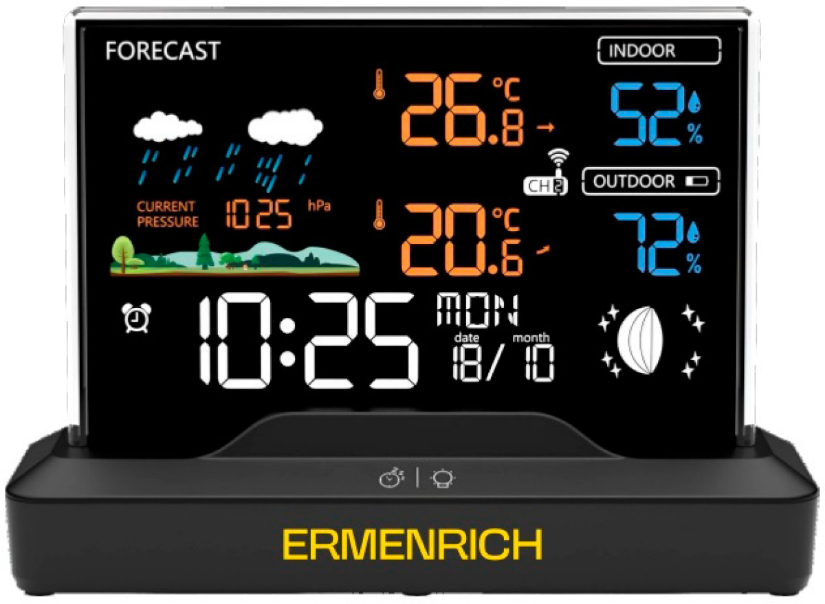Метеорологичната станция Ermenrich Report WR40 е специално проектирана за домашна употреба и бързо събиране на най-важните атмосферни параметри. Тя има цветен екран на VA матрица на изискана вертикална стойка, която може да се монтира на всяка удобна повърхност у дома. За да се вземат показания отвън, уредът използва дистанционен безжичен сензор, захранван от две батерии тип AAA. Максималният обсег на сигнала е 80 m; честотата на радиосигнала е 433,92 MHz.