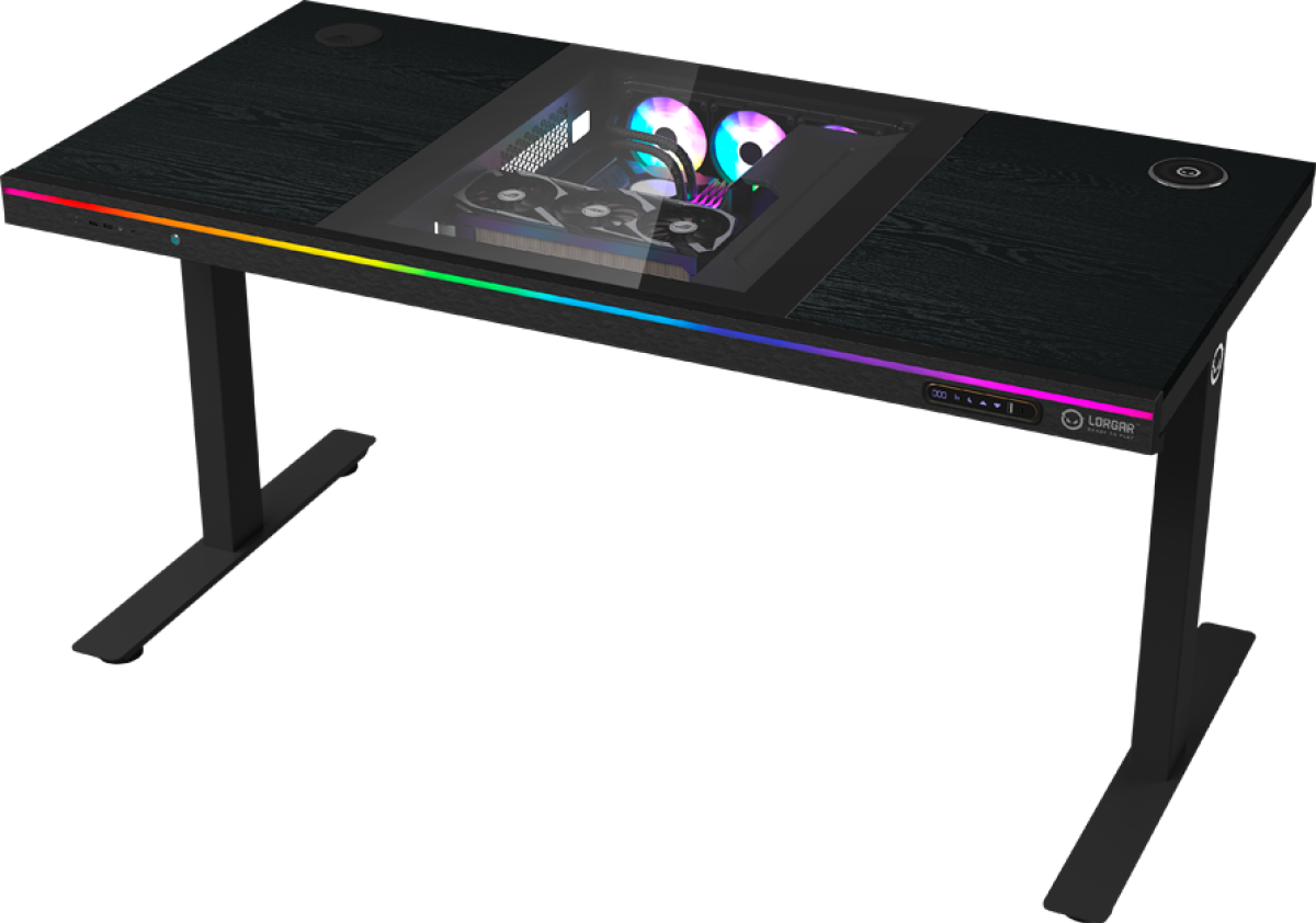 LORGAR DE90W добавя практичност с USB зарядно и безжично зарядно устройство (Qi), както и с вградени EU контакти за подреден кабелен мениджмънт. Превключваемата RGB подсветка допълва атмосферата в геймърския кът, а подбраните материали като алуминий и стъкло подсилват усещането за висок клас геймърско бюро и standing desk решение.