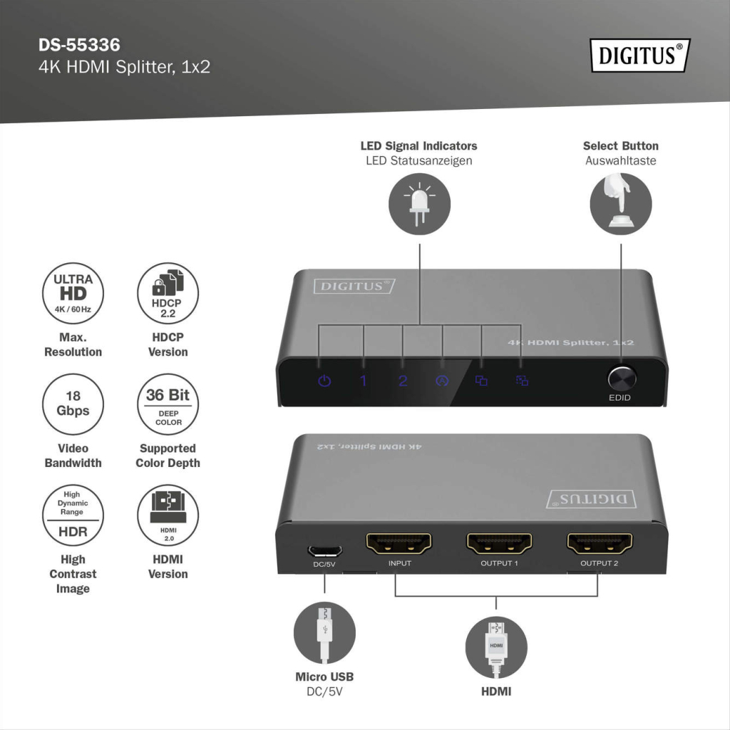 DIGITUS DS-55336, HDMI сплитер, 1x2, 4K UHD, 60Hz, HDCP 2.2, 18 Gbps, EDID, 5W, 36 Bit, HDR, черен