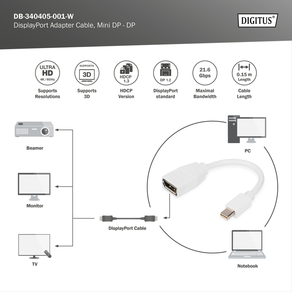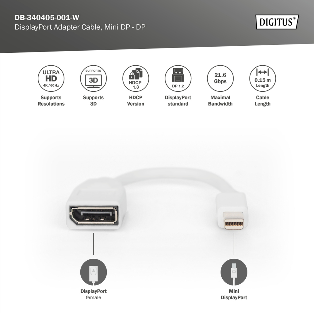 DIGITUS DB-340405-001-W :: Адаптер Mini DisplayPort - DisplayPort, M-F, 4K, DP v1.2, mini DP - DP, бял