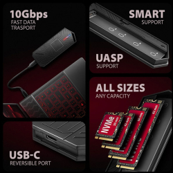 С поддръжка на UASP, TRIM и S.M.A.R.T. получавате по-висока производителност, по-добра поддръжка на SSD във времето и удобен мониторинг на състоянието на диска. Благодарение на модерния чипсет, AXAGON EEM2-GAM работи както с M.2 NVMe, така и с M.2 SATA устройства, без да се налага да избирате конкретен тип кутия.