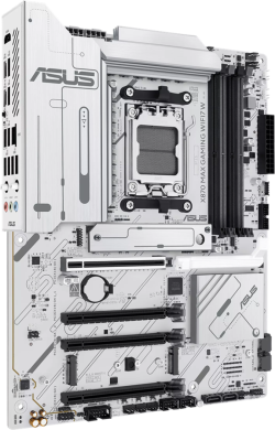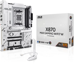 ASUS X870 MAX GAMING WIFI7 W е ATX дънна платка с чипсет AMD X870 и сокет AM5, създадена за модерни гейминг и високопроизводителни конфигурации с DDR5 и бързи интерфейси.