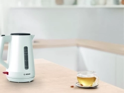 Bosch TWK1M121 е електрическа кана от серията MyMoment с мощност 2400 W и вместимост 1.7 l, създадена за бързо и удобно приготвяне на топли напитки у дома.