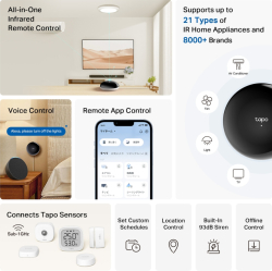 С универсално IR дистанционно управлявате климатик, телевизор, вентилатор, осветление и други инфрачервени устройства, без да разчитате на куп дистанционни. Благодарение на широка съвместимост (18 типа устройства и над 8 000 марки) и редовни обновления на базата данни, TP-Link Tapo H110 покрива както нови, така и по-стари уреди.