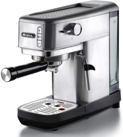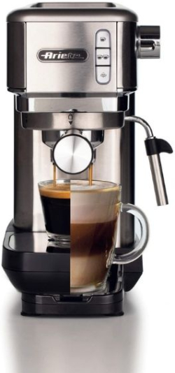 Ariete 1380-10 Slim Metal е компактна полуавтоматична еспресо машина, създадена за любителите на класическото кафе у дома. Работи със смляно кафе и кафе дози и приготвя до 2 чаши едновременно.