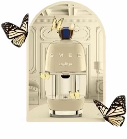 Lavazza Кафе машина A Modo Mio SMEG, кремава съчетава емблематичен ретро дизайн и бързо приготвяне на кафе с капсули за автентично италианско изживяване у дома или в офиса.