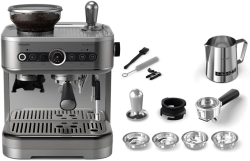 Машината е подходяща за еспресо, двойно еспресо и американо, а включената кана за мляко и функцията за млечна пяна ви дават възможност за напитки в стил кафе-бар. Металният корпус и практичните аксесоари допълват усещането за полуавтоматична еспресо машина от висок клас за домашен кафе бар.
