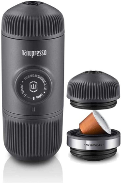 Wacaco Nanopresso + NS Adapter, за капсули Nespresso, 18 bar, съвместим с Nanopresso, черен е компактно решение за приготвяне на еспресо навсякъде, когато искате удобство и постоянен вкус. Комбинацията от Nanopresso и NS Adapter ви позволява да използвате Nespresso капсули с високо налягане 18 bar.