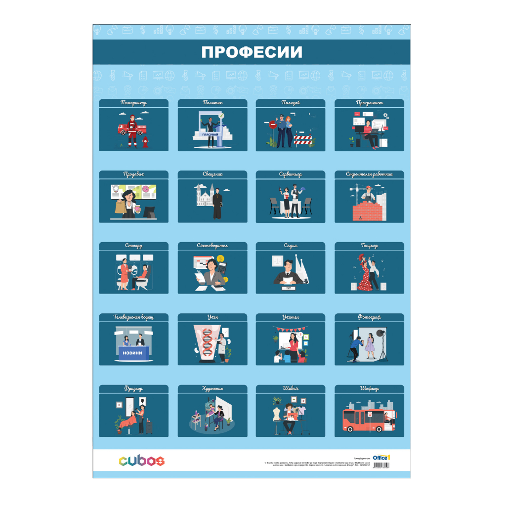 - Двустранно ламинирано учебно табло. В него са изобразени някои от най-разпространените професии.