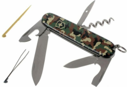 - Джобен нож Victorynox Spartan Camouflage с 12 функции: голямо острие, малко острие, тирбушон, отварачка за консерви с мини отверка, отварачка за капачки с голяма отверка, улей за оголване на кабели, шило, халка за ключове и/ли верижка, пинцета, клечка за зъби.