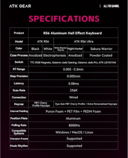 Корпусът с алуминиева основа и PBT капачки Dye-Sub PBT Cherry Profile допринасят за стабилност, комфорт и дълготрайност. ATK професионална геймърска механична клавиатура Professional Gaming Mechanical Keyboard RS6 Ultra - 8K е отличен избор за фенове на механична клавиатура, RGB подсветка и висок клас геймърска клавиатура за eSports.