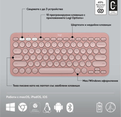 Комплектът LOGITECH Pebble 2 Bluetooth Keyboard Combo в цвят Tonal Rose предлага стилно и практично решение за работа и забавление на различни устройства. Клавиатурата е компактна и безжична с Bluetooth/RF свързване и Easy-Switch бутон за бързо превключване между до три устройства. Мултимедийните функции осигуряват удобен контрол върху аудио и видео съдържание, а включената оптична мишка с чувствителност 1000 dpi и скролиращо колело гарантира плавна и точна работа. Комплектът е съвместим с Windows, Mac, Linux, iOS и iPad, което го прави универсално решение за различни платформи.