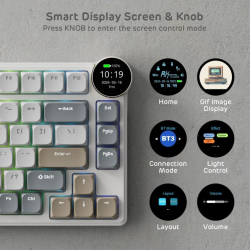Клавиатурата поддържа кабелна и безжична връзка чрез Bluetooth или RF, има LCD екран и 3750 mAh батерия за дълга автономия. Съвместима е с Windows, macOS, Android и iOS и включва USB Dongle, USB Type-C кабел и ключодържател за лесно използване и персонализация.