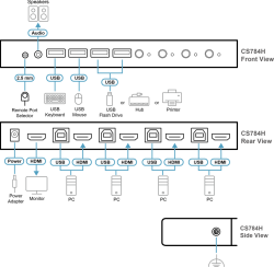 KVM Суич ATEN CS784H, контрол на 4 HDMI+USB. 4K е професионално решение за управление на до четири компютъра от една конзола с HDMI монитор, USB клавиатура и USB мишка. Подходящ е за работни станции, домашен офис и среди, където бързото превключване и стабилната картина са критични.