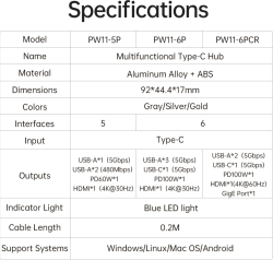 Orico докинг станция Docking Station Type-C - PW11-6PR-GY-EP - HDMI x 1, USB-C x 1, USB3.0 x 3, USB-C PD100W x 1, LAN x 1 (1Gbps)