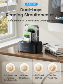 Orico докинг станция Storage - HDD-SSD Dock - 2 BAY Offline Clone 2.5-3.5 USB-C-USB-A - DD28C3-C е практично решение за бързо свързване и управление на 2.5" и 3.5" SATA дискове към компютър чрез USB-C или USB-A.