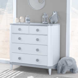Изработен от ПДЧ с дебелина 18 мм, Скрин за дрехи с пет чекмеджета ADEN е стабилен избор за спалня, детска стая или коридор. Подходящ е и като шкаф с чекмеджета или комод за допълнително съхранение, без да заема излишно пространство.