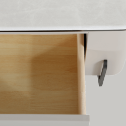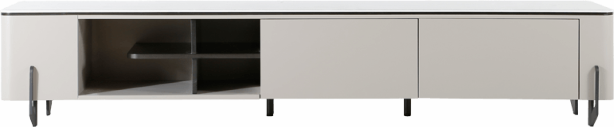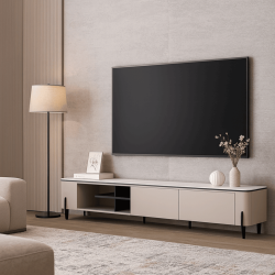 Комбинацията от керамичен плот и основа от МДФ придава изчистена визия и усещане за премиум завършеност. С дължина 200 см този ТВ шкаф предлага стабилна и просторна повърхност за телевизор и декорация, като се вписва отлично в интериори в светли и топли тонове.