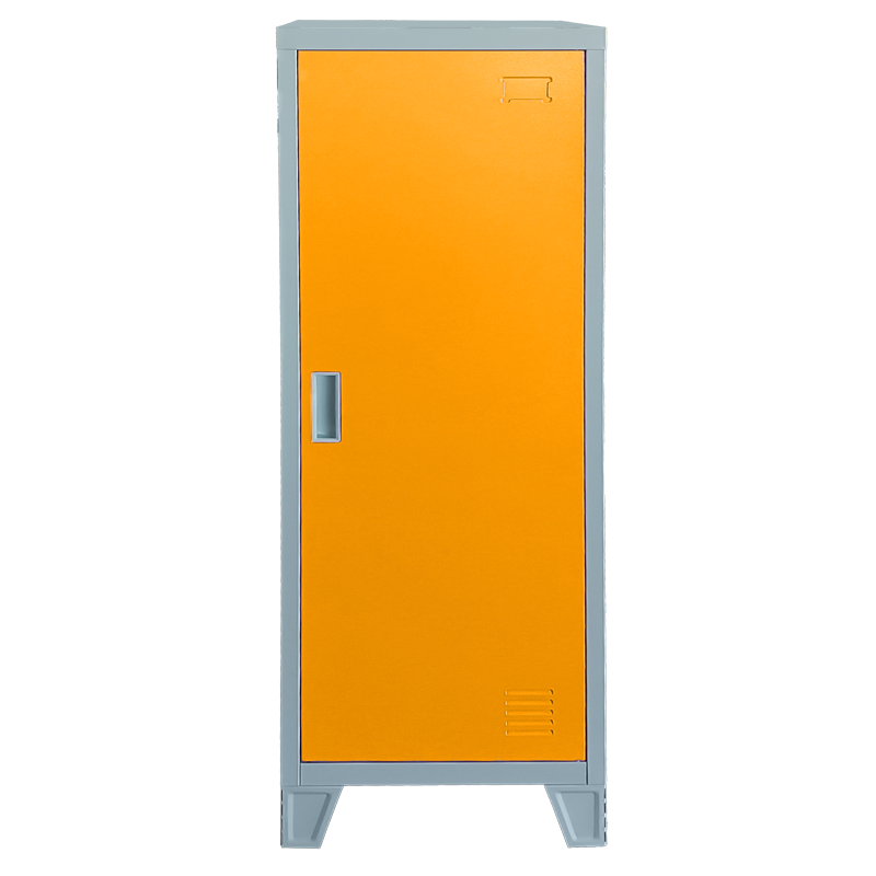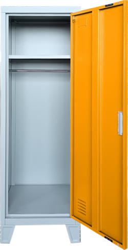 Метален шкаф Carmen CR-1605-1 JZ - сив / оранжев разполага и с вентилационен отвор, който подпомага проветряването на вътрешността – полезно при ежедневно ползване в съблекални. Грапавото шагрен покритие допринася за по-добра устойчивост при натоварена среда и придава завършен индустриален вид на шкаф за съблекалня или метален шкаф за дрехи.