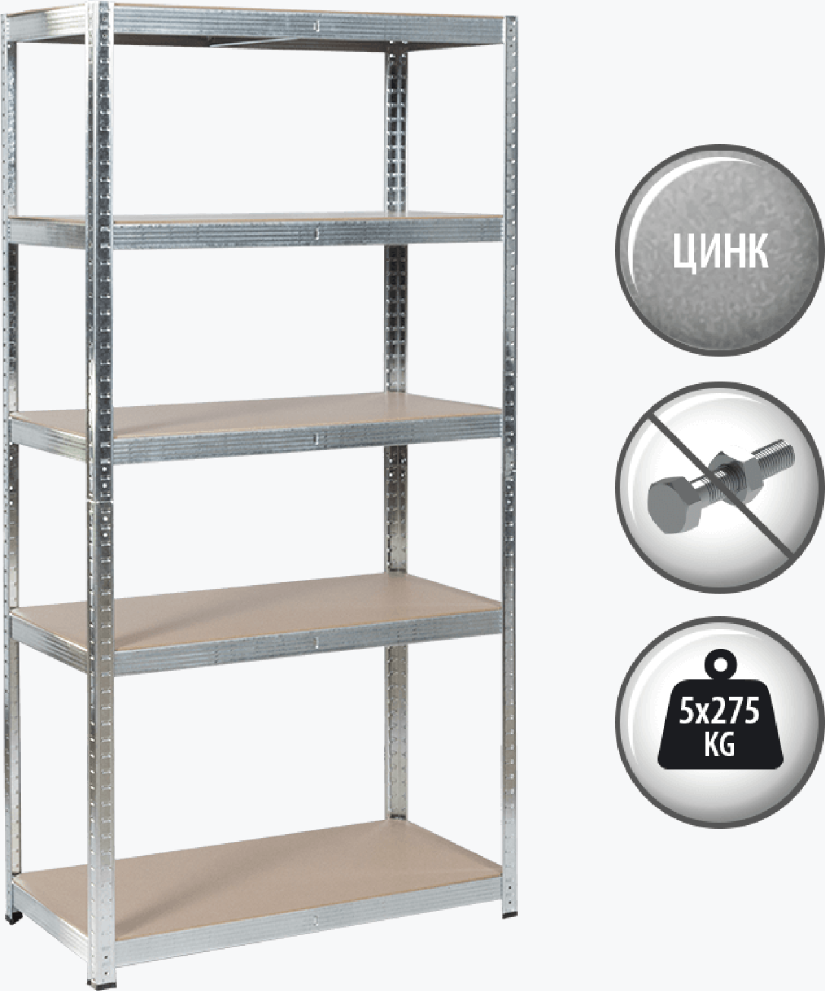 Метален стелаж Carmen CR-1020 - 180х90х45 см, до 275 кг на рафт - цинк е практично решение за подредба и съхранение в гараж, склад, работилница или сервиз. Конструкцията е от галванизиран метал с рафтове от МДФ за стабилност и надеждност.