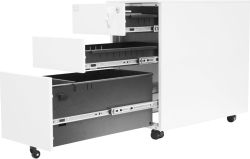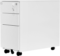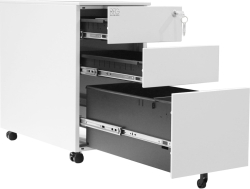 Здравата стоманена конструкция с прахово боядисано гладко покритие е подходяща за ежедневна интензивна употреба, а заключването с ключ добавя спокойствие при съхранение на важни документи. Двете стандартни чекмеджета улесняват организацията на канцеларски материали, докато третото чекмедже е предназначено за висящи папки A4 – идеално за архив и текущи проекти.