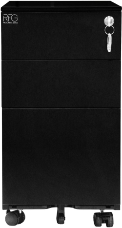 Контейнер RFG, метален, с три чекмеджета и ключ, 300 х 600 х 560 mm, черен е практично решение за подреден и сигурен офис. Подходящ е за ежедневна организация на документи и консумативи в работното пространство.