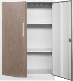 Здравата стоманена конструкция с прахово боядисано гладко покритие е подходяща за ежедневна употреба, а заключването на вратите помага да защитите документи, консумативи и техника. Двата рафта са с регулируема височина, което улеснява организацията според нуждите ви.