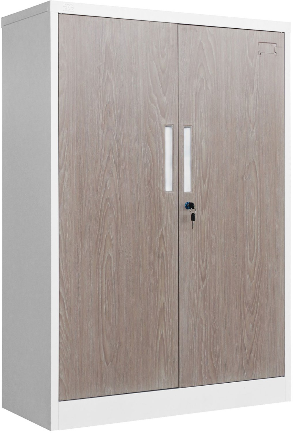 Съчетавайки бял корпус и врати в цвят кехлибарен дъб, този метален офис шкаф се вписва естествено в модерни интериори. Шкаф RFG е удобен избор, когато търсите надежден шкаф за документи с оптимални размери и добра товароносимост.