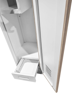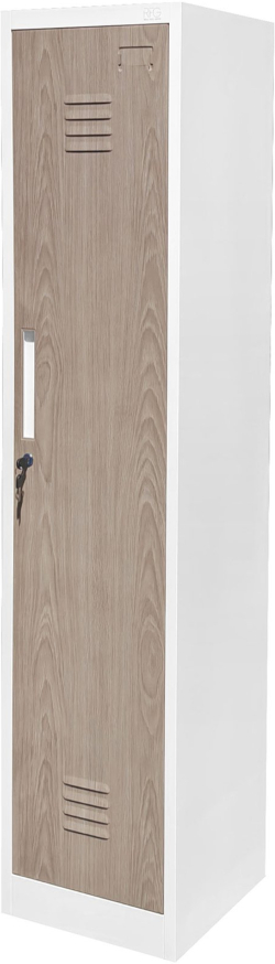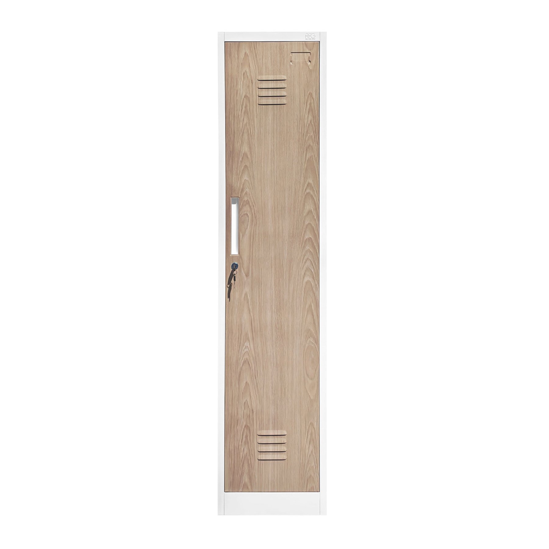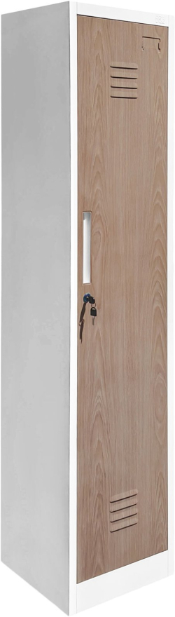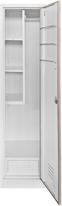 Металната конструкция от стомана с дебелина 0.6 mm и прахово боядисано гладко покритие осигуряват надеждност и лесна поддръжка при ежедневна употреба. Комбинацията от бял корпус и врати в кехлибарен дъб придава по-приятен, „мебелен“ вид, без компромис с устойчивостта на метален шкаф.