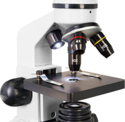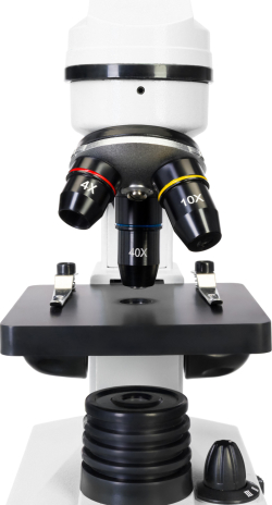 Лещите са изработени от специално оптично стъкло с висока прозрачност. Всички оптични повърхности са покрити с многослойно антирефлексно покритие, поради което микроскопът създава отчетливи, контрастни, много детайлни изображения на наблюдаваните образци. Три обектива Ви позволяват да получите широка гама от увеличения от 40x до 400x. Можете лесно да промените увеличението чрез завъртане на револверната глава.