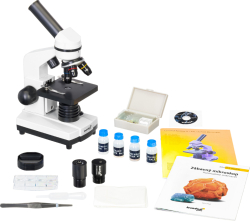 Микроскопът се получава с набор за експерименти Levenhuk K50. Комплектът включва всичко, което може да иска един начинаещ биолог – като се започне с готови за употреба предметни стъкла за микроскоп и се завърши със специални инструменти за подготовка на Ваши собствени образци. В ръководството за потребителя е поместена цялата необходима информация за микроскопа, препоръки и съвети за неговото използване и описания на експерименти.