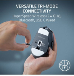 Мишката предлага безжично свързване чрез Bluetooth или 2.4 GHz технология, като батерията осигурява до 450 часа живот на Bluetooth и до 285 часа на 2.4 GHz, гарантирайки безпроблемна игра без прекъсвания. Шестте програмируеми бутона позволяват персонализирани команди, а Razer Chroma RGB подсветката добавя стилен визуален акцент. Ергономичният дизайн и теглото от само 61 г я правят изключително удобна за дясна ръка, подходяща за Windows и macOS потребители, които търсят бързина, точност и контрол.