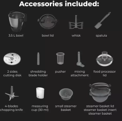 Издръжливата купа от неръждаема стомана (3,5 L) и аксесоарите, подходящи за съдомиялна машина, спестяват време при подготовката и почистването. Широкият температурен диапазон 37–130°C и прецизната вградена везна до 5 kg дават контрол за разнообразни рецепти – от тесто и ферментация до готвене на пара и бавно готвене. Това е практичен избор за модерна кухня и мултифункционален кухненски уред.
