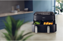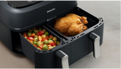 PHILIPS Airfryer Series 3000 с двойна кошница е практичен фритюрник с горещ въздух за бързо и равномерно готвене с малко или без масло. С капацитет 9 литра е подходящ за семейни порции до 6 души.