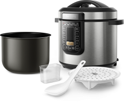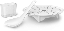 PHILIPS Multicooker All in One 6L 1300W Slow cooking предлага програми като печене, готвене на пара, десерти и кисело мляко, както и сотиране за бърза подготовка на съставките. Автоматичното поддържане на топлината и подвижният таймер добавят удобство, когато искате ястието да е готово точно навреме. В комплекта са включени полезни аксесоари за по-лесна работа, включително съд за готвене на пара и книжка с рецепти.