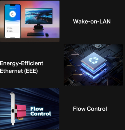 За удобство и ефективност, Mercusys MA510E предлага Wake-on-LAN за дистанционно включване/изключване и Energy Efficient Ethernet (EEE) за по-ниска консумация на енергия. В комплекта са включени стандартна и нископрофилна скоба за гъвкав монтаж в различни компютърни кутии, а съвместимостта с Windows и Linux го прави подходящ избор за домашни и офис системи, както и за сървърни среди.