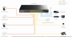 С 24 Gigabit Ethernet порта (10/100/1000 Mbps) и поддръжка на IEEE 802.3at/af PoE, устройството позволява едновременно пренос на данни и захранване по мрежов кабел към IP камери, VoIP телефони и Wi‑Fi точки за достъп. Двата SFP порта осигуряват гъвкави uplink връзки и по-лесно разширяване на инфраструктурата.