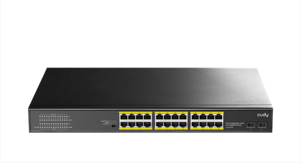 Суич Cudy GS1028PS2 е надежден 24-портов Gigabit PoE+ комутатор с 2 SFP uplink порта, създаден за стабилна и бърза свързаност в бизнес мрежи и системи за видеонаблюдение.
